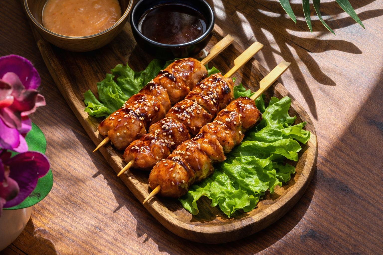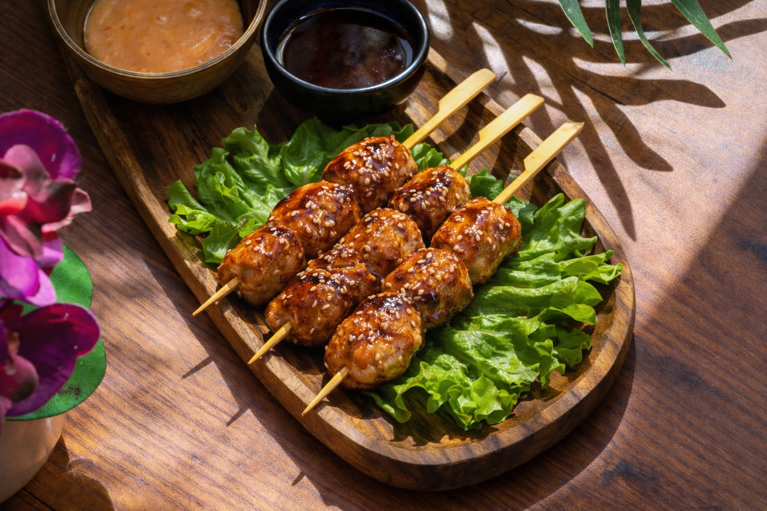 Boulettes de poulet japonaises grillées au charbon, délicatement nappées de sauce tare sucrée-salée et légèrement caramélisées. Texture fondante et juteuse.